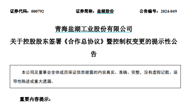 9月8日,央國企整合重組又有大消息。鹽湖股份發布公告稱,公司控股股東(dong) 青海省國有資產(chan) 投資管理有限公司與(yu) 中國五礦集團有限公司及下屬子企業(ye) 簽署合作總協議,計劃共同組建中國鹽湖集團,公司實控人將由青海省政府國資委變更為(wei) 中國五礦集團。根據公告,中國鹽湖注冊(ce) 資本100億(yi) 元,其中,中國五礦持股53%,青海省政府國資委持股18.73%,青海國投持股28.27%。組建後的中國鹽湖集團將致力於(yu) 成為(wei) 世界一流的鹽湖產(chan) 業(ye) 集團,帶動世界級鹽湖產(chan) 業(ye) 基地的建設和發展。