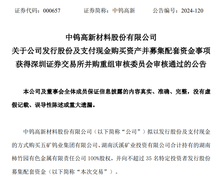 11月15日,中鎢高新的並購重組項目也審核通過。這是自今年證監會(hui) 發布“並購六條”新政後,第一個(ge) 適用快速審核通道的並購重組項目。根據公司公告,中鎢高新材料股份有限公司擬以發行股份及支付現金的方式購買(mai) 五礦鎢業(ye) 集團有限公司、湖南沃溪礦業(ye) 投資有限公司合計持有的湖南柿竹園有色金屬有限責任公司100%股權。經此交易,將有效實現對鎢產(chan) 業(ye) 鏈的資源整合。