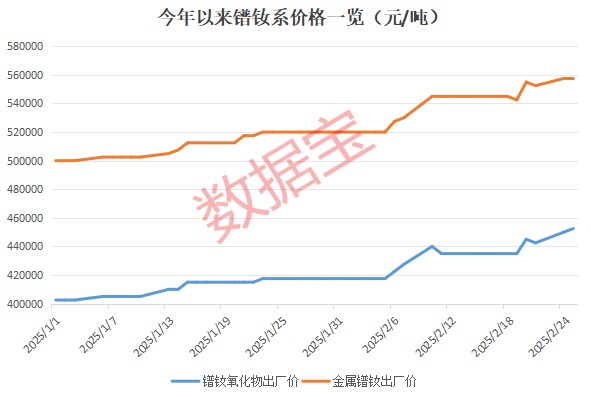 春節過後,稀土永磁價(jia) 格快速走高。行業(ye) 網站顯示,截至2月25日,氧化鐠釹出廠價(jia) 格已超45萬(wan) 元,達到45.25萬(wan) 元/噸,相比春節前上漲8.38%,相比年初上漲12.42%,創2024年以來新高;金屬鐠釹最新價(jia) 超過55萬(wan) 元,達到55.75萬(wan) 元/噸,相比年初上漲11.5%,也創2024年以來新高。